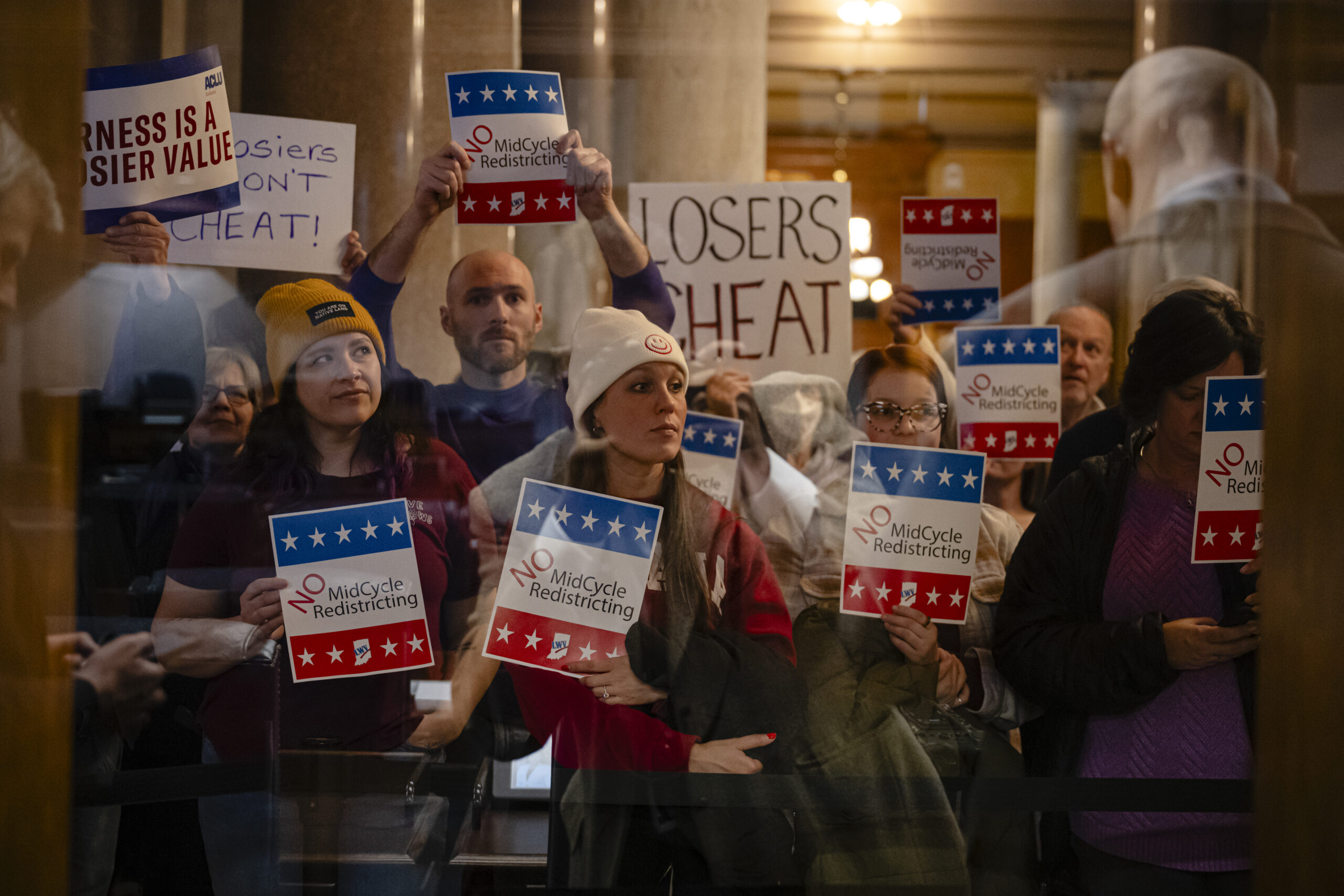Demonstrators protest against the vote to redraw the state’s congressional map at the Indiana Statehouse in Indianapolis, Dec. 11, 2025. (Jon Cherry/The New York Times)